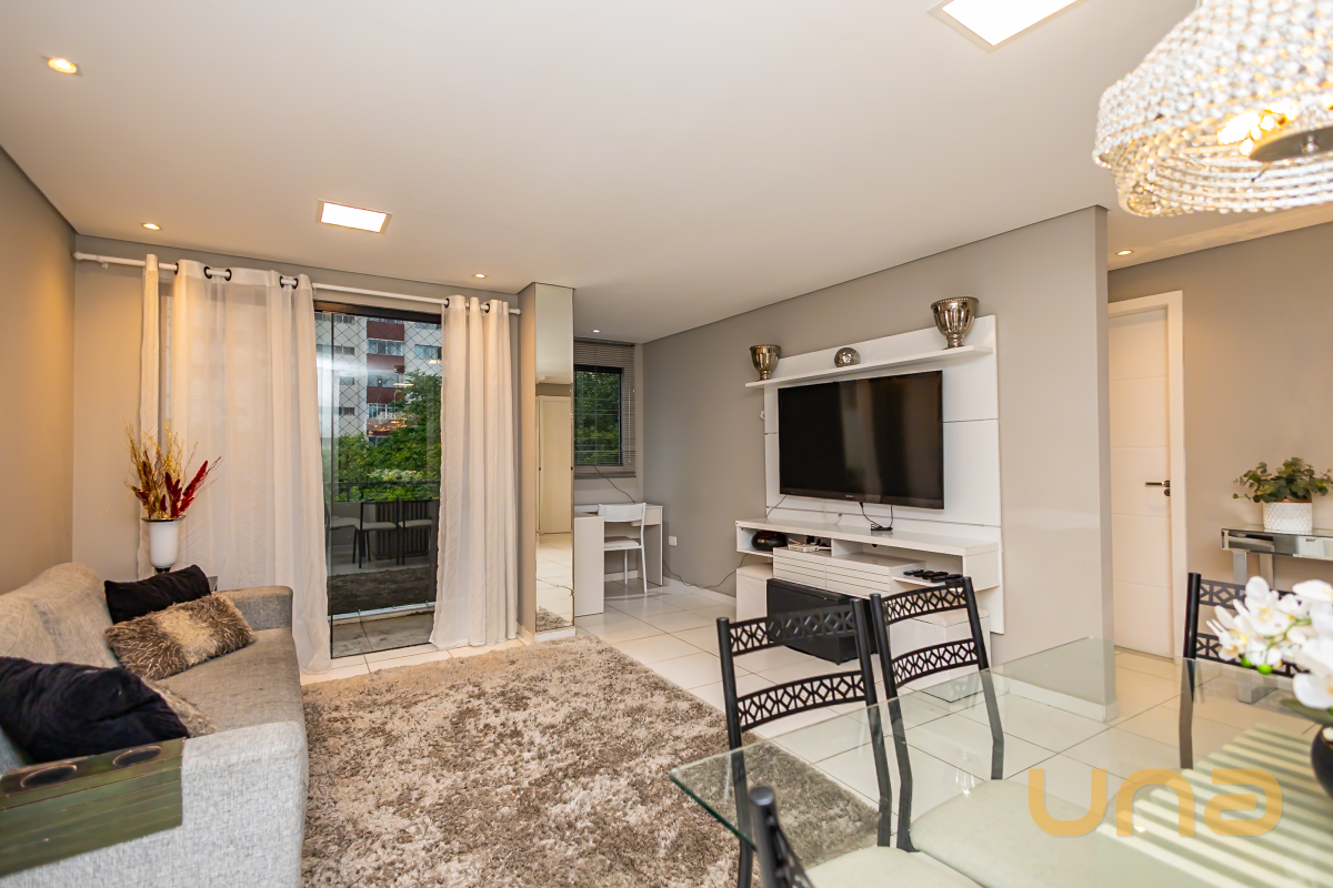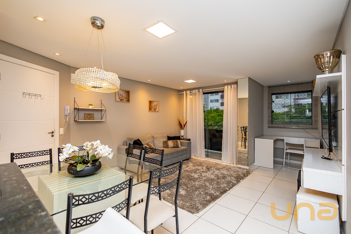 Apartamento mobiliado com 70m² de área privativa, composto por 2 quartos, sendo 1 suíte o imóvel possui uma sala ampla para dois ambientes, equipada com sofá e TV, integrada à sacada, com piso em cerâmica, painel decorativo e excelente iluminação natural. Ao lado da sala, há um escritório funcional, além de um mezanino, que agrega charme e versatilidade ao espaço. A cozinha em estilo americano conta com bancadas em granito, armários embutidos, fogão e geladeira, oferecendo praticidade no dia a dia. A suíte dispõe de armários planejados, garantindo conforto e organização. Além de 1 vaga de garagem coberta.