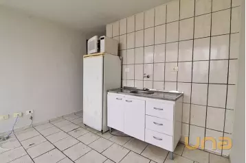Cozinha conjugada, equipada com pia em balcão, refrigerador e micro-ondas, oferecendo praticidade no dia a dia.