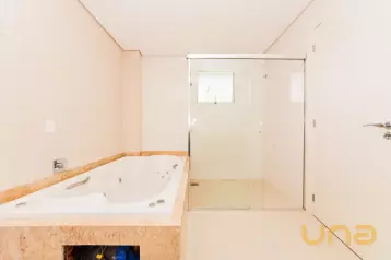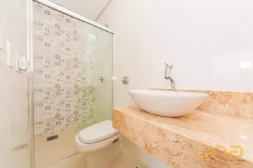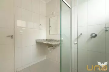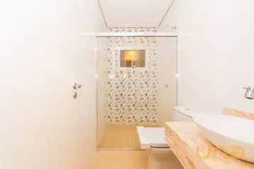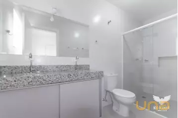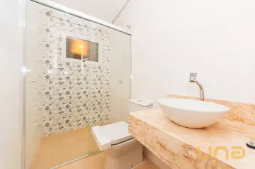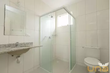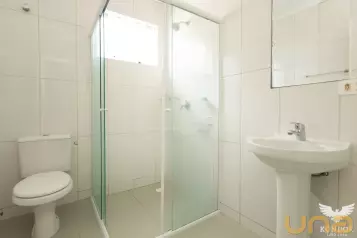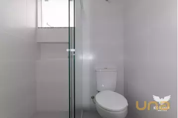 - Banheiro da suíte equipado com box de vidro espelho e chuveiro elétrico
