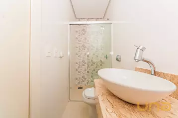 - Banheiro social com box de vidro espelho e chuveiro elétrico