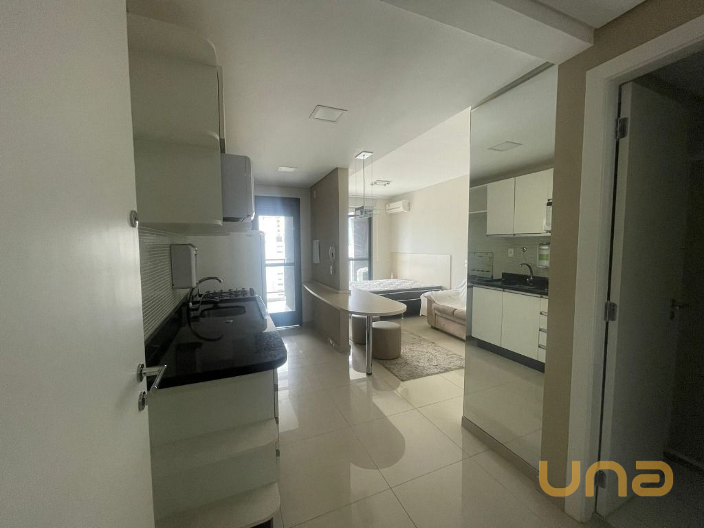 Sala/quarto, cozinha, área de serviços, banheiro, sacada ampla com churrasqueira.