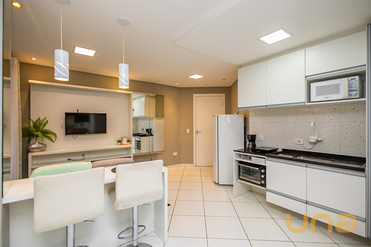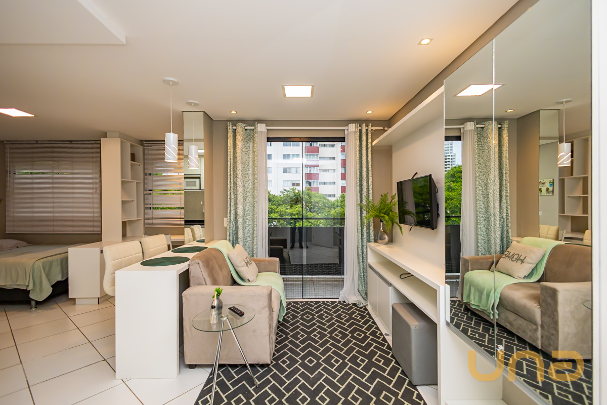 Studio mobiliado, com 28m² de área privativa, ideal para quem busca praticidade e conforto. O imóvel conta com uma sala ampla para dois ambientes, equipada com sofá e TV, integrada à sacada, com piso em cerâmica, painel decorativo e excelente iluminação natural.