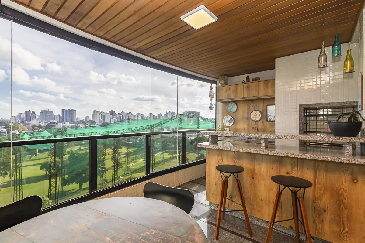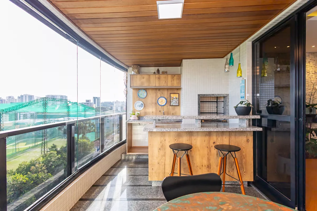 Apartamento com 3 quartos com armários, sendo 1 suíte, sacada com churrasqueira, balcão em granito, sala para dois ambientes com lareira e lavabo; cozinha com armários, área de serviço com armários; dependência de empregada com banheiro e 2 vagas de garagens.