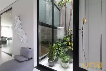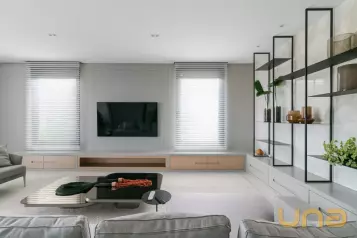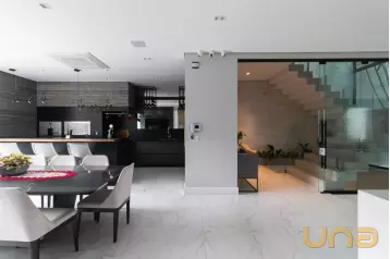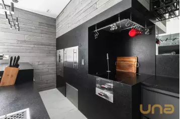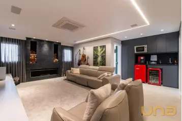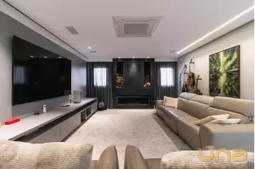 - Ampla sala para 02 ambientes, com desnível, piso em madeira, lustres e estante;