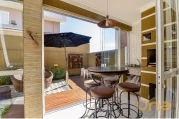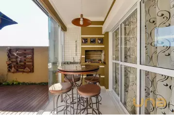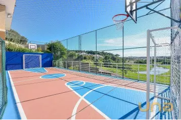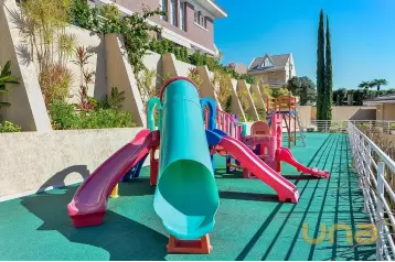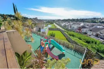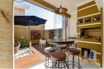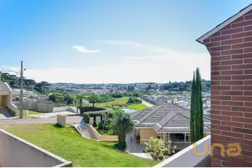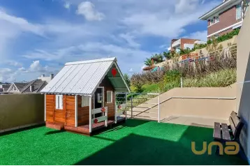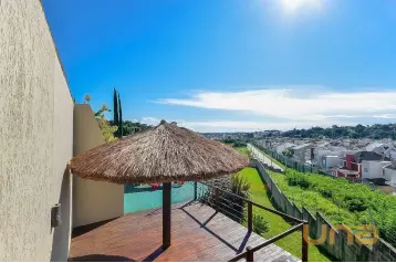 Espaço gourmet coberto com churrasqueira, de frente para um amplo terreno gramado