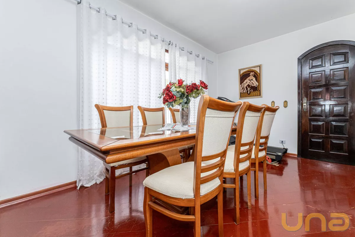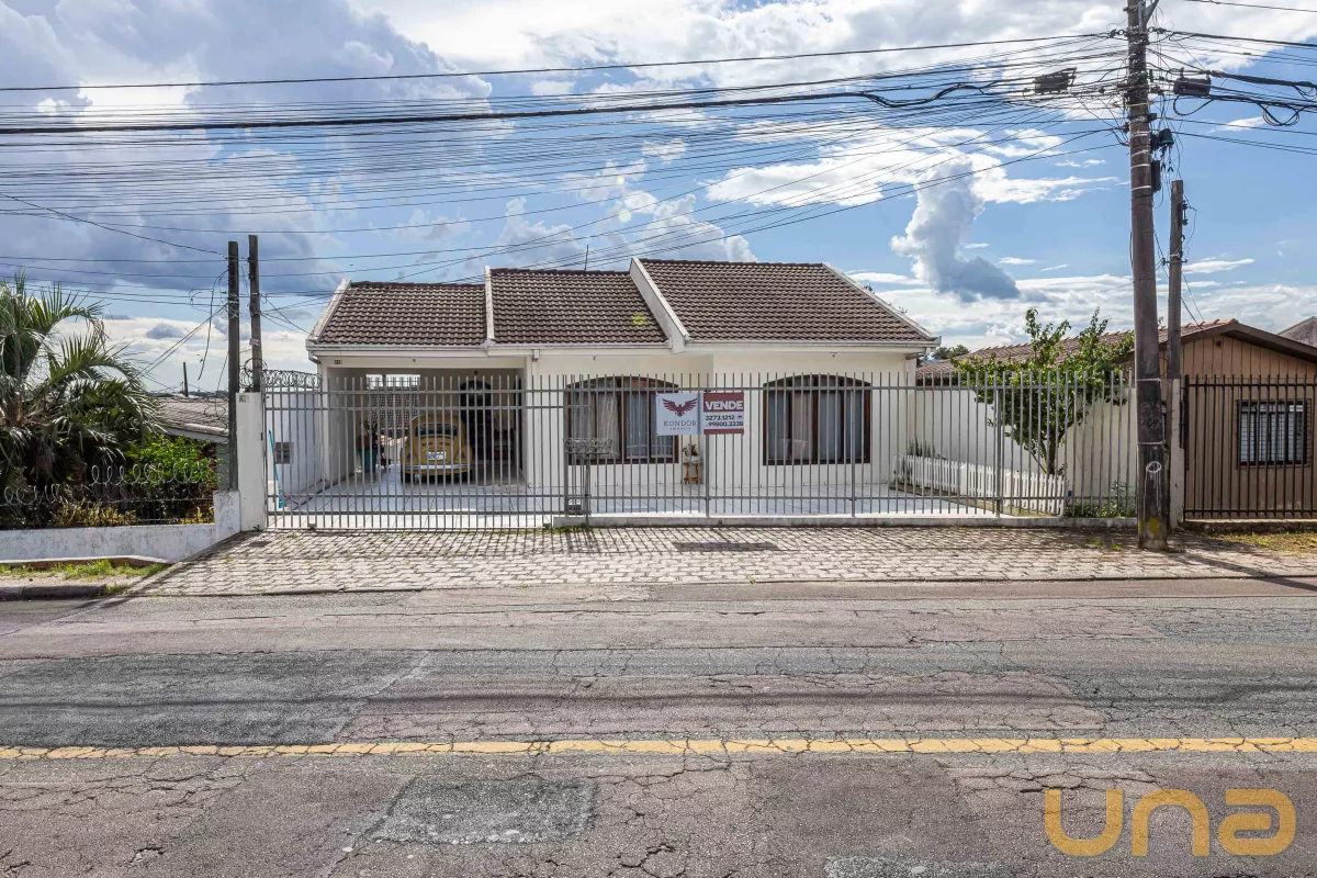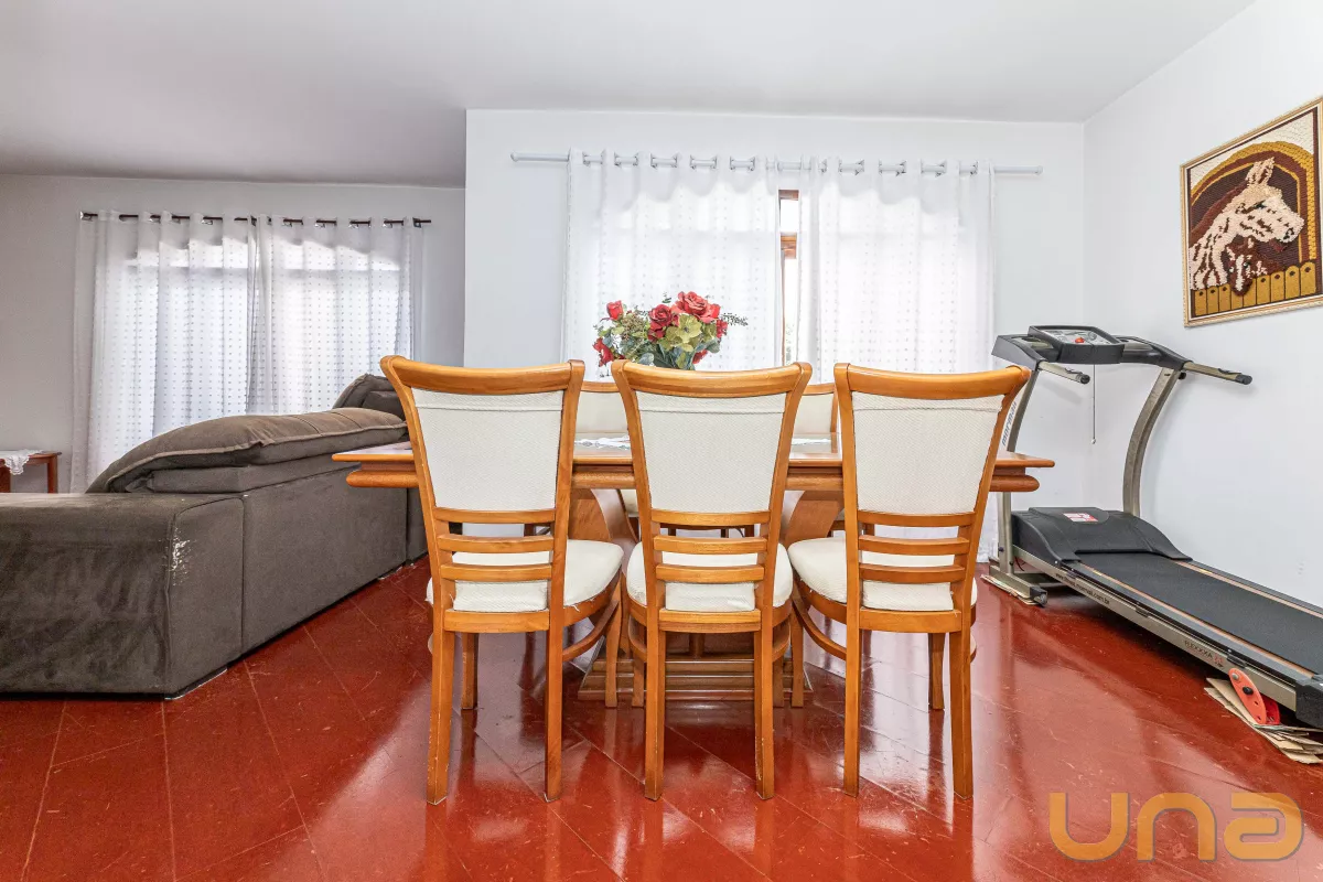 Casa com sala para dois ambientes, cozinha com armários, três quartos sendo um suíte, tudo no nível da rua. Como o terreno tem um declive, na parte inferior tem um quarto, cozinha e banheiro e quintal.