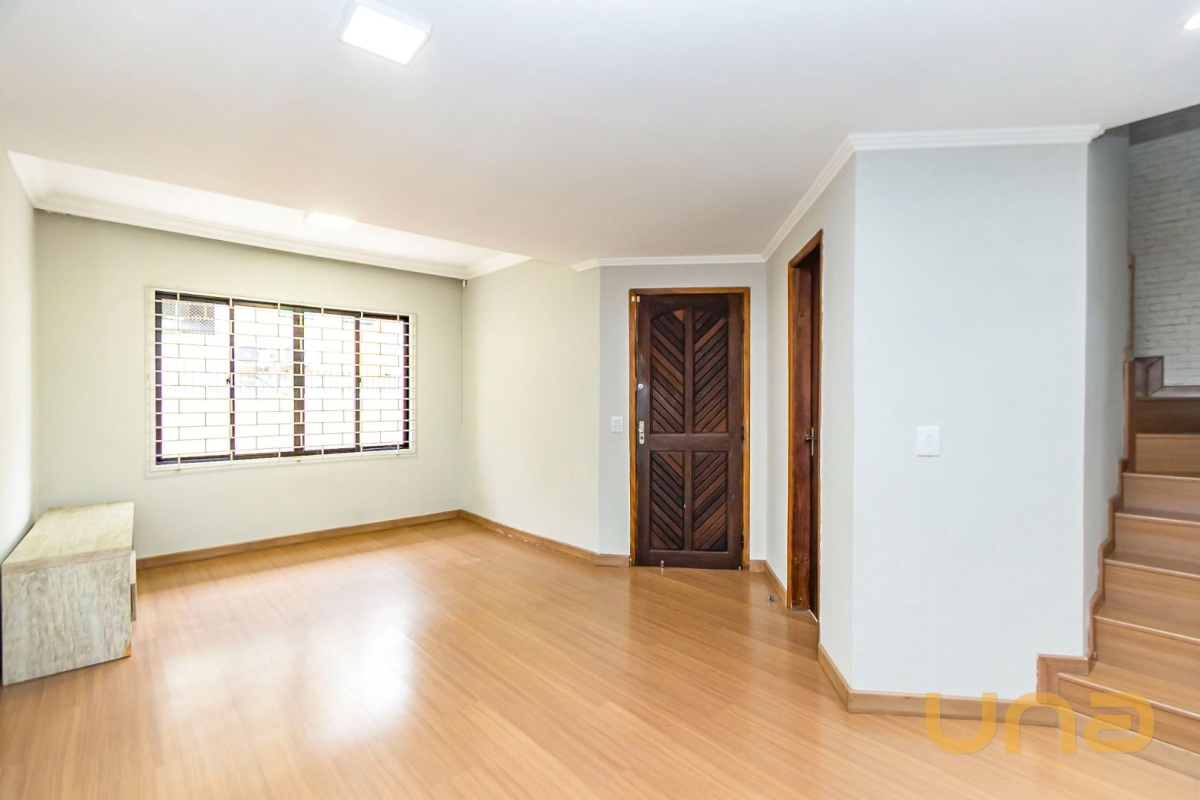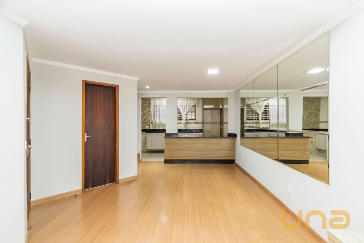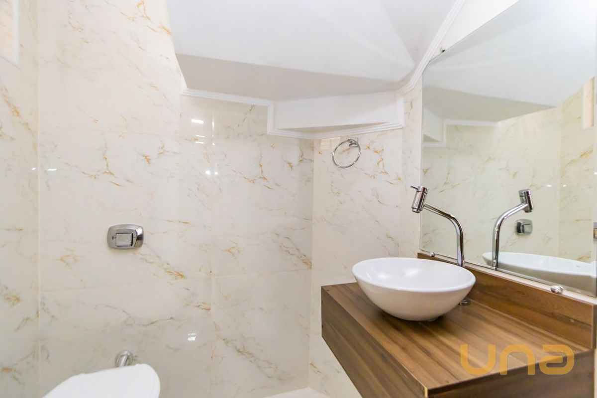 Sala de estar, sala de jantar e cozinha integradas, lavabo, lavanderia e área de lazer com churrasqueira.