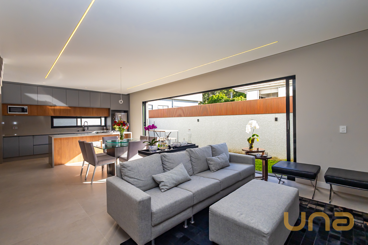 Esta é daquelas casas que conquistam logo de cara. Os ambientes sociais totalmente integrados criam uma atmosfera muito acolhedora, perfeita para viver o dia a dia com leveza e receber bem. Sala de estar, jantar e cozinha gourmet se unem em um único espaço, que ganha ainda mais vida quando a porta de vão livre de mais de 6m se recolhe atrás do drywall, conectando tudo ao jardim como se fosse uma grande varanda aberta. Um detalhe que transforma a experiência da casa.